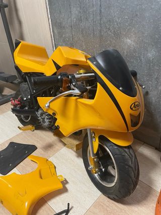 Minimoto de competición en color amarillo. Se vende con piezas para arreglarla, esta gripada pero compre las piezas para arreglarla no la arreglo x falta de tiempo si estás interesado escribeme para lugar de recogida o venir a verla - Carrocería amarilla. - Incluye piezas de repuesto.