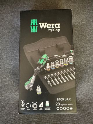 Juego de carraca Wera Zyklop de 28 piezas métricas. - Carraca con cabeza flexible. - Mecanismo de giro rápido. - Dientes finos para un ajuste preciso. - Incluye buscador de herramientas 'Take It Easy'.