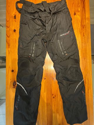 Pantalón de moto de la marca Seventy Degrees en color negro. Diseñado para ofrecer comodidad y protección en tus rutas. - Material textil resistente. - Cremalleras de ventilación. - Protecciones en rodillas. - Tirantes ajustables. - Detalles reflectantes. Solo se ha usado una vez.