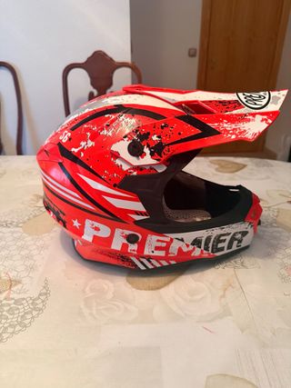 Casco de motocross de la marca Premier en talla M. Diseño llamativo con detalles en rojo, blanco y negro. - Diseño con salpicaduras y detalles gráficos. - Visera superior integrada.