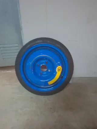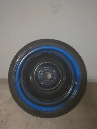 Rueda de repuesto temporal, también conocida como galleta. - Llanta de color azul. - Neumático en buen estado. - Etiqueta amarilla con indicación de velocidad máxima 80 km/h.