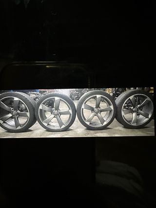 Juego de llantas de aleación Audi de 5 radios. Diseño deportivo y elegante. - Acabado gris metalizado. - Logo de Audi en el centro. - Borde pulido.