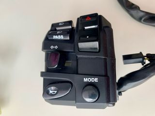 Nueva Piña de mandos izquierda para motocicleta Yamaha MT 09, Tracer 900. Incluye los botones de luces, intermitentes, claxon y modo. Conmutador. Conjunto de mandos para manillar de motocicleta Yamaha. - Incluye interruptor de luces (posición y cruce). - Botón de PASS para ráfagas de luz. - Pulsador de intermitentes (izquierdo y derecho). - Botón de MODE para selección de modos. - Pulsador de bocina. - Indicador de emergencia (triángulo rojo). - Conector de cableado.