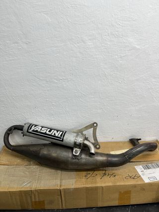 Escape yasuni R para motores minarelli horizontal. Con papeles de homologacion‼️ Con fibras y junta nuevas.✅ Pequeños bollos q no influyen en su funcionamiento. Solo le falta el muelle y los tornillos del silencioso, por lo demas esta completo