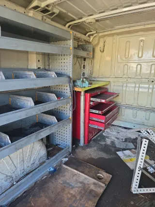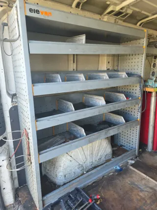 Estanterías metálicas para taller o furgoneta. - Estructura robusta de color gris. - Múltiples baldas para organización. - Ideal para herramientas y materiales.