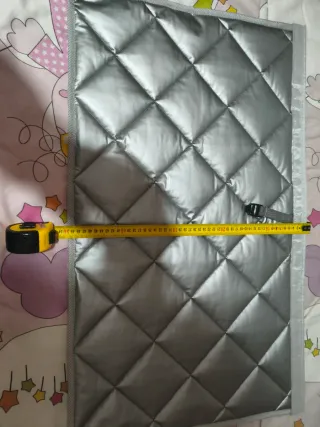 Toldillas nuevas para ventanas de caravana. Son plateadas y acolchadas con un diseño de rombos. - Material: Poliéster plateado. - Diseño: Acolchado con rombos. - Cierre: Correa con clip.