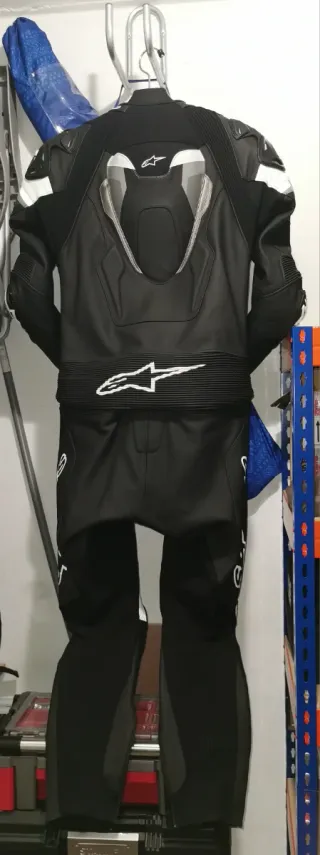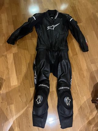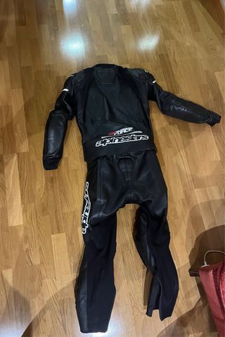 Mono de cuero Alpinestars de dos piezas. Utilizado 4 días. - Chaqueta de cuero negra con detalles blancos. T-54 - Pantalón de cuero negro con protecciones.T-50 - Marca Alpinestars visible en varias partes.