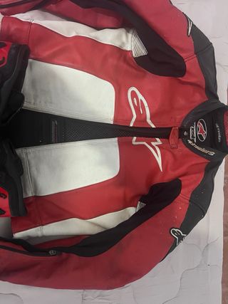 Mono de cuero de dos piezas para moto, ideal para pilotos. - Color rojo, blanco y negro. Talla 54 - Marca Alpinestars. - Incluye botas de moto a juego.Talla 42