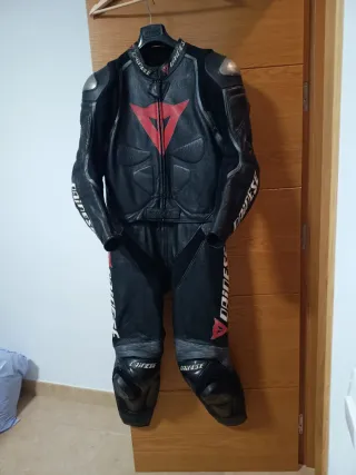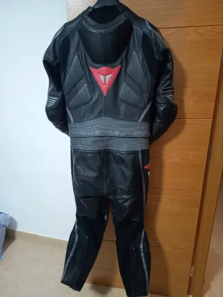 Mono de moto Dainese de dos piezas. - Talla 52. - Chaqueta y pantalón unidos por cremallera. - Diseño deportivo con detalles en rojo, blanco y negro. - Material de cuero. - Sólo tiene un par salidas. - Vendo también botas Alpinestar a juego. También cambio por algo de mi interés.
