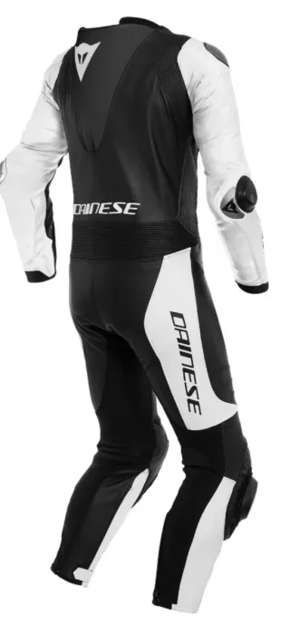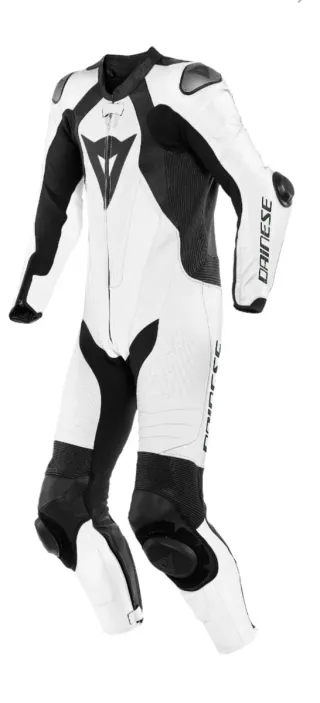 Mono de cuero Dainese Laguna Seca. - Diseño deportivo en blanco y negro. - Logos de Dainese visibles en mangas y cuello. - Cremallera frontal.