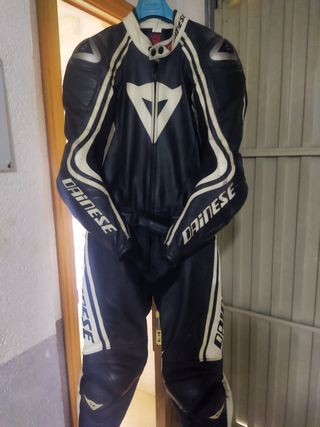 Mido 1,73 y peso 73kg, complexión atletica. Traje de moto de dos piezas Dainese Laguna Seca D1 en cuero. Está en muy buen estado. - Cuero de alta calidad - Diseño de dos piezas con cremallera. - Protecciones en hombros, codos, rodillas y espinillas. - Doble cremallera para ventilacion en espalda. - Doble cremallera en gemelo para cierre y ajuste. - Incluye joroba