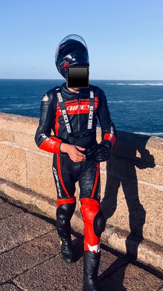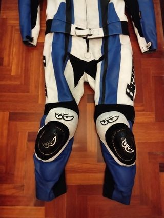 Mono de moto entero, dos piezas. Chaqueta y pantalón. Protecciones en codos y hombros de titanio, deslizaderas en codos. Deslizaderas Dainesse incluidas. Chepa grande. Interior muy suave. Costó 850 nuevo, no ha tocado asfalto. Talla m (170-175cm 65-70kg aprox)