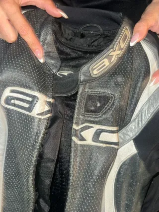 Mono de moto de dos piezas en color negro con detalles blancos de la marca AXO. Incluye espaldera y deslizaderas. Tiene algún raspón y un agujero pequeño en la pierna, y le falta una hombrera (se pueden sustituir).