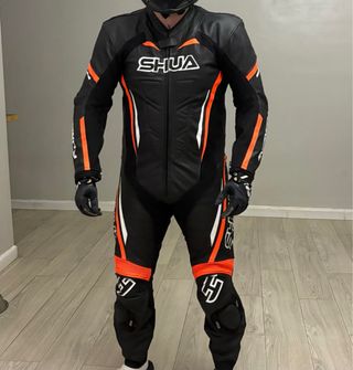 Mono de moto de cuero con protecciones. - Diseño deportivo en negro con detalles en naranja y blanco. - Marca: SHUA. - Incluye deslizaderas - Talla 56 - Usado dos rutas
