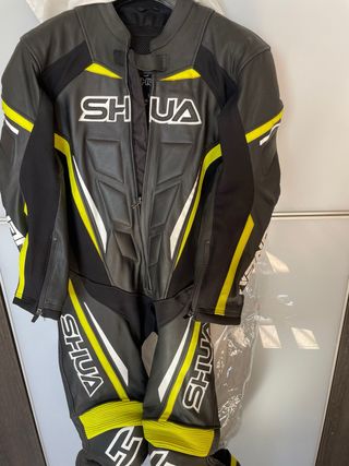Mono de cuero para moto de la marca SHUA. Diseño deportivo con detalles en amarillo y blanco. - Material: Cuero - Color: Negro, amarillo y blanco - Cierre frontal con cremallera - Cremalleras en puños y tobillos TALLA S