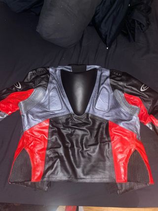 Mono dos piezas Spyke talla 52. Costó más de 500. Usado un viaje. Gran calidad de piel. Protecciones en rodilla y laterales, codos hasta muñeca y hombros. Hueco para espaldera (no incluida). Se ve en la foto la calidad de las cremalleras, para separar la chaqueta del pantalón y usar sólo la chaqueta. Vendo con pena por no uso, tratable