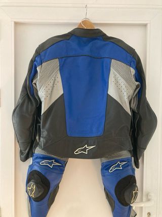 Conjunto de mono de dos piezas de la marca Alpinestars, con protecciones en codos, hombros, espinilleras y deslizaderas,en muy buen estado. Chaqueta talla 50 EUR/40 USA Pantalón talla 50 EUR/ 34 USA