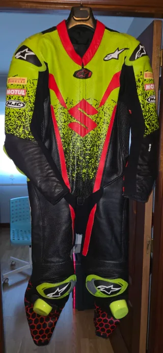 Mono de piel de vacuno, de 1 pieza, colores flúor, negro y rojo. Talla 54 Talla L Para una persona que mida entre 175 cm y 190 cm. Protecciones integradas y desmontables. #mono moto #alpinestars #dainese #revit #suzuki