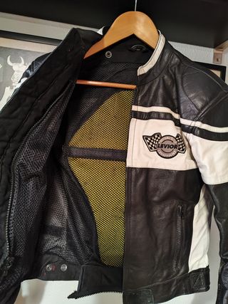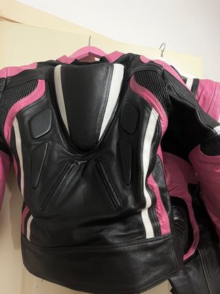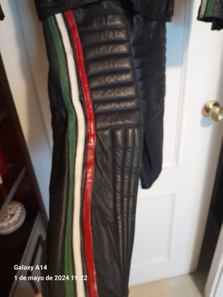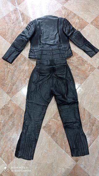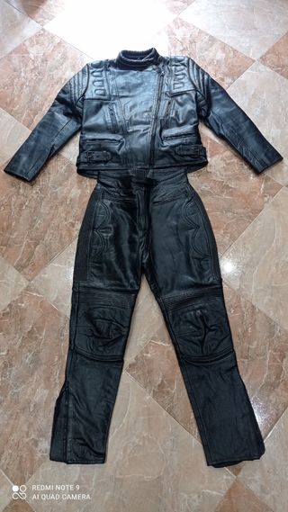 Marca Levior, en buenas condiciones. La chaqueta es talla 40, tiene protecciones rígidas en espalda, codos y hombros, tiene también chalequillo interior desmontable. El pantalón es talla 42 y se acopla mediante cremallera a la chaqueta.
