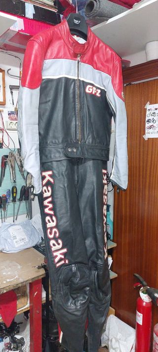 Mono de piel Kawasaki GPZ de dos piezas, talla aproximada 52. Está en muy buen estado, sin arañazos ni roturas visibles. - Marca: Kawasaki GPZ - Talla: 52 (aprox.) - Material: Piel - Dos piezas