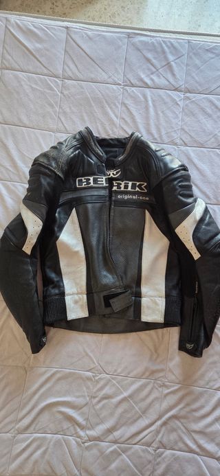 Mono de cuero Berik de dos piezas, ideal para motociclismo. Compuesto por chaqueta y pantalón. Talla 48 - Chaqueta de cuero negra con detalles blancos y grises. - Pantalón de cuero negro con protecciones en rodillas. - Cierre de cremallera en la cintura para unir ambas piezas. Usado 3 veces