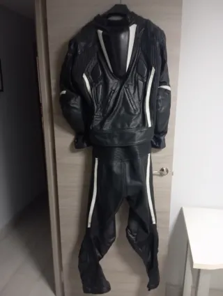 Mono de cuero para moto de dos piezas, en color negro con detalles blancos, Tiene alguna reparación en las rodillas ya que se usaba para hacer pitbiker, es ideal para circuito Es para una persona de 180 y 75kg aprox - Chaqueta de cuero negra con detalles blancos. - Pantalón de cuero negro con protecciones y detalles blancos.