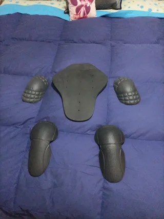 Set de protecciones para equipamiento de moto. - talla de edad media 12 años. - para meter en chaqueta o mono. - Incluye protecciones para rodillas hombros y espalda. - Fabricadas en material resistente.