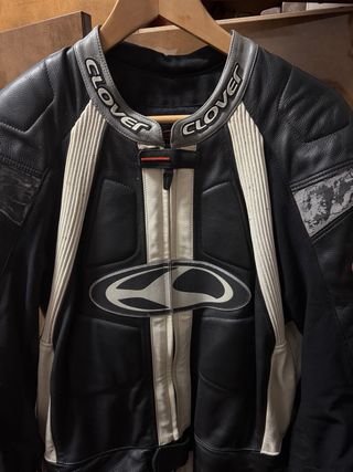 Mono de moto de cuero de la marca Clover, en color negro y blanco. Ideal para pilotos. - Diseño deportivo. - Cierre frontal con cremallera. - Logos de la marca visibles.