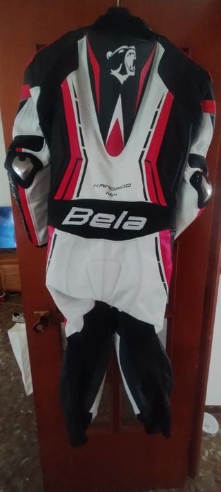 Mono de moto de la marca Bela, ideal para pilotos. - Diseño deportivo en blanco, rojo y negro. - Materiales de alta calidad para protección. - Logos de la marca visibles. -Piel de vacuno. -Lo vendo ya que ya no tengo moto y vivo en otro pais