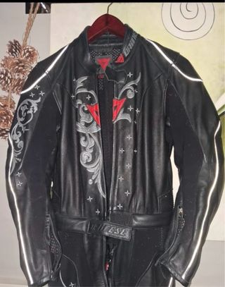 Mono de cuero Dainese con diseño. -Talla 36 - Color negro. - Detalles plateados y rojos. - Cierre de cremallera frontal. - Esta en perfecto estado -Cualquier duda consultarme