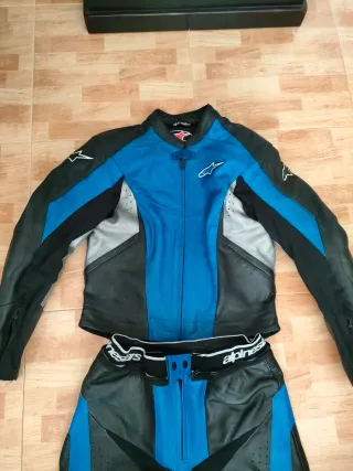 Mono de cuero de dos piezas de la marca Alpinestars talla 52. Cazadora puesta 3 veces y el pantalón nuevo a estrenar. Comprado en Albacar por 800 euros. Vendo por enfermedad y no llevar moto, solo entrego en mano en Zaragoza. Precio NO NEGOCIABLE 270 euros, te ahorras 530. - Color azul, negro y gris. - Talla 52.