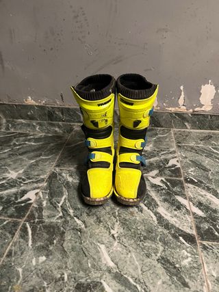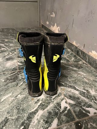 Botas de moto marca Thor, modelo Moto Cross. Color amarillo vibrante con detalles en negro y azul. - Cierre con hebillas. - Diseño robusto para protección. - Precio negociable
