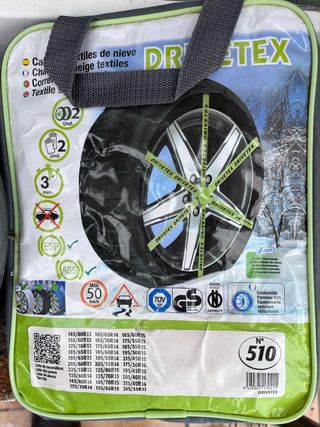 Cadenas textiles para nieve DRIVETEX, modelo 510. Se instalan fácilmente en 3 minutos. Cadenas metálicas RD-9 60 10€ cada juego. - Incluye 2 unidades. - Compatibles con ABS y ESP. - Velocidad máxima recomendada: 50 km/h. - Lista de medidas de neumáticos compatibles incluida.