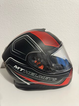 Casco de moto con diseño deportivo en negro y detalles en rojo. Cuenta con una visera transparente. - Diseño MT. - Color negro y rojo. - Visera transparente. -Talla 55-56 S