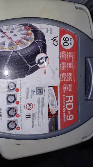 Cadenas para nieve RD-9, talla 90. Diseñadas para un montaje fácil y rápido. - Eslabón de 9mm. - Sistema de bloqueo y muelle tensor. - Homologadas por la DGT. - Velocidad máxima recomendada: 50 km/h. - Contenido: repuesto de eslabones y manual de instrucciones.
