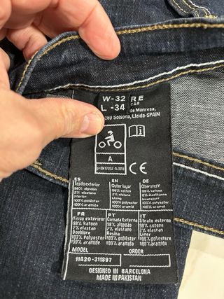 Pantalón vaquero de la marca Armure, modelo Conrad. - Talla 32. - Color azul Confeccionado en 98% algodón y 2% elastano. Protecciones desmontables en rodillas con certificación CE EN 1621-1:2012 Nivel 2. La altura de la protección de las rodillas es regulable. Protecciones de cadera Hip Protector Nivel 2. Forro interior en fibra de aramida estratégicamente ubicado que ofrece excelente resistencia a la abrasión. Revestimiento interior en tejido de malla de poliéster para mayor transpirabilidad. Corte regular. 2 bolsillos exteriores en la parte frontal.