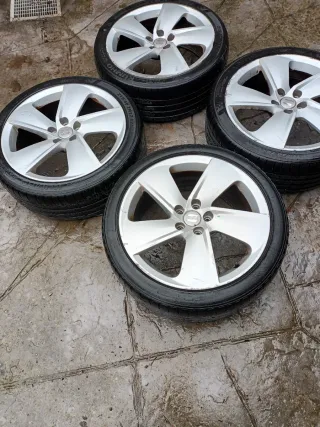 Juego de 4 llantas de aleación de 17 pulgadas para Seat Toledo. NO CAMBIOS. - Diseño de 5 radios. - Acabado plateado. - Patrón de pernos 5x100 - Compatible con otros modelos del grupo VAG. - Algún arañazo en las llantas pero están perfectas. - Ruedas para cambiar. Eje trasero (2) gastadas pero con dibujo. Eje delantero (1) a medio uso, otra (1) con un año pero tiene una deformidad en el lateral. Ver fotos.