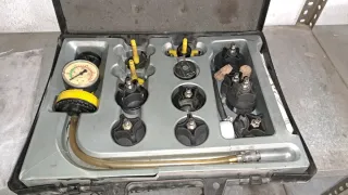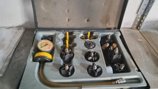Por cierre de taller por jubilación se vende Maletín para medir la compresión de motores. Incluye varias piezas y un manómetro. - Maletín de transporte. - Manómetro de presión. - Adaptadores para diferentes motores.