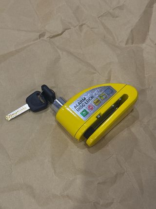 Candado de disco amarillo para moto con función de alarma y sensor de impacto. Incluye dos llaves. - Alarma sonora de alta potencia. - Sensor de movimiento y vibración. - Construcción robusta y duradera. - Resistente al agua.