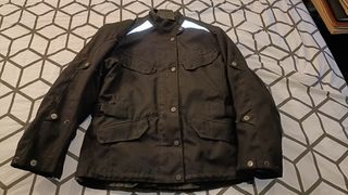 Se vende cazadora de moto con protecciones duras, talla 46 (M-L), negra, tipo cordura. Fuerte, pero bastante ligera. Calentita y aguanta el agua, pero con forro interior que se puede sacar (cremallera), con lo cual también es fresca si se necesita. Lavable (la acabo de lavar). Está en muy buenas condiciones. Tiene tiempo, pero muy poco uso. Oportunidad de asegurarse el poder mantenerse seco y calentito por muy poco dinero! Tiene varios bolsillos por fuera y por dentro. Súper práctica! Aprovecha la oportunidad!