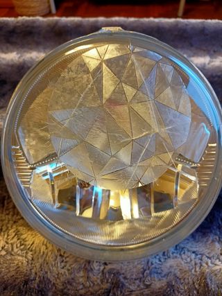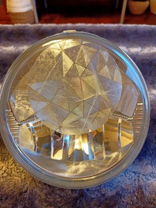 Faro original transparente de moto BMW R 1200 R de 2012, tiene varias rayas pero no entra agua y define perfectamente por lo que pasa las ITV. Se le ha puesto un vinilo que disimula el defecto y se puede poner y sacar porque está adherido estáticamente.