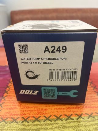Bomba de agua marca DOLZ, modelo A249. - Aplicable para Audi A3 1.9 TDI Diesel. - Fabricado en España. - Fecha de fabricación: 30/04/2025. - Código de barras: 8430632012492.