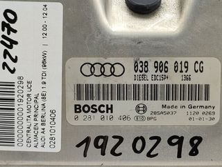 Centralita motor uce AUDI A4 BERLINA 8E Año 2000 1.9 TDI 96KW . Referencia 0281010406. Observaciones 038906019cg. Código interno 1920298.