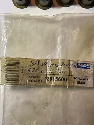Se vende Kit vastago/reten de varvula 16 marca Ajusa nuevos !!!Referencia 12015600 para motor bmw 204D4 (150cv) 2,000cc y para motof 6 cilindros 3,000cc!!! Mas informacion por privado mensajes o via WhatsApp envío + foto o video + acepto oferta de envío por aplicación Wallapop o Entrega en Badalona o Barcelona zona Maragall !!! Precio No negociable Gracias !!!