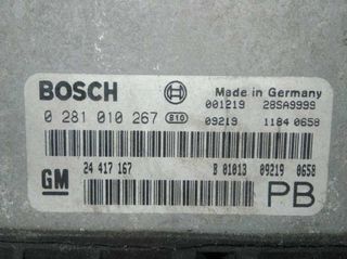 40964 Referencia 24417167. centralita motor uce OPEL ASTRA G BERLINA CLUB Año 1998. Observaciones Bosch 0281010267 001219 28sa9999 09219 1184 0381 24417167. Código interno 668380.