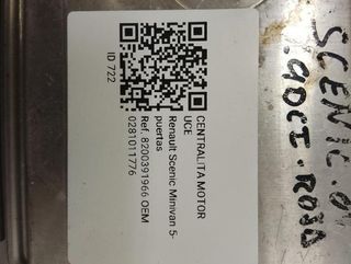 Centralita motor uce RENAULT SCENIC - 2 GENERACION 2003 - 2006 - MINIVAN 5-PUERTAS Año 2003 1.9 DCI MT 120 CV . Referencia 0281011776 8200391966 8200386508. Código interno 722.