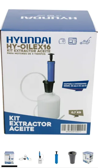 Kit extractor de aceite Hyundai HY-OILEX16 para motores de 4 tiempos. Ideal para el cambio de aceite. - Adaptable a contenedores de 36 mm a 51 mm de diámetro. - Peso: 0,7 kg.