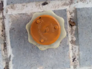 Tapa y soporte para el vaso de expansión de un Peugeot 205. - Color naranja y blanco. - Fabricado en plástico.
