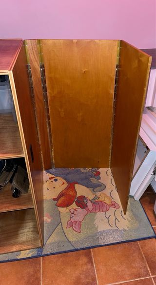 Mueble de madera con compartimentos y puertas. Contacto por teléfono,643964648 - Diseño abierto con estantes. - Tres puertas frontales. - Material de madera contrachapada.