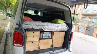 Mueble camper para volkswagen Montado en una transporter T5. -Tengo el colchon para vender a parte, si te llevas el mueble y el colchon lo dejo todo en 200€ El motivo de su venta es porque se rompio el motor y la vendi sin mueble. Es de vanessa mobilcamping tiene su tiempo pero sigue funcionando.